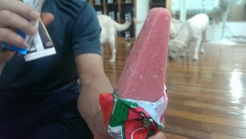 Up left to right: Strawberry ice cream stick and Hershey's Chocolate Corn and Chocolate Ice Tube. Down left to right: Watermelon ice cream stick and Coffee water ice.