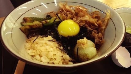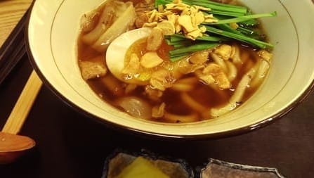 I ordered a warm Udon noodle soup with thinly sliced pork meat, crispy fried garlic slices and Chinese chives. Both soup bases are made of the dashi stock. For the dashi stock dried bonito flakes and kombu seaweed are used. Udon soups are always very light and really tasty. You want to drink the whole soup until the last drop. 😃