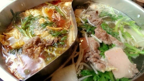 The employee set our table with a table cooker on which the two different soups were cooked in a divided pot. One soup had a spicy-deep-taste and the other soup more lightly-vegetable-taste.