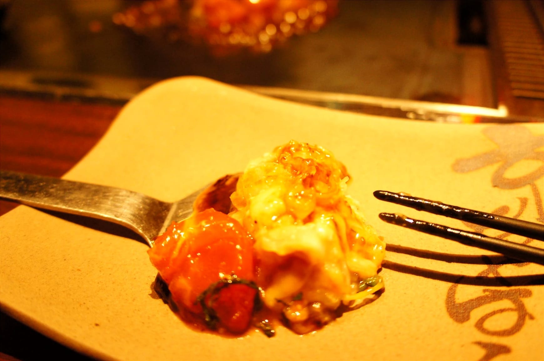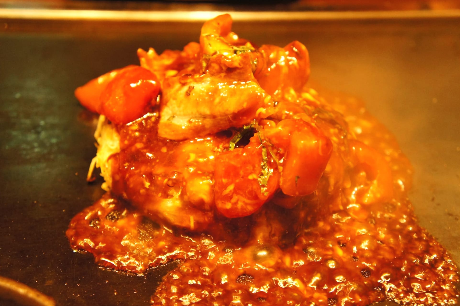 Okonomiyaki could be described as the Japanese pancake made with wheat-flour, cabbage, eggs, tempura bits, bacon, green onion and like Takoyaki topped with mayonnaise, okonomiyaki sauce, dried bonito flakes and seaweed powder. We had the one with tomato and cheese on our first day in Osaka.