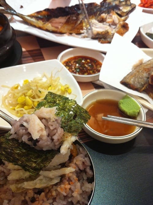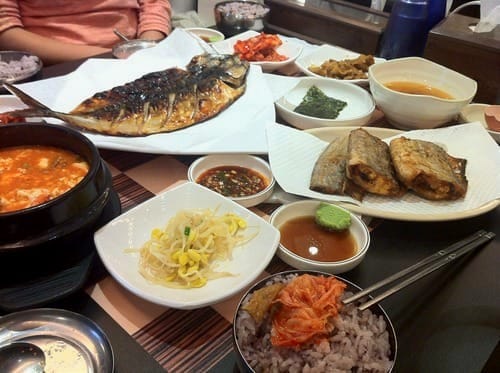 Sundubu Jjigae (순두부찌개) is a spicy Soft Tofu Stew and is usually eaten with different banchans and rice, here with a red-bean rice. Most places which are specialized in Sundubu Jjigae also serve different kinds of grilled fishes. Here I had grilled mackerel and swordfish. I think it's the best fish and one of the must-try foods in Seoul!