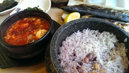 신촌 맷돌순두부, Sundubu restaurant in Sinchon near U-Plex. Here the rice is cooked in granite-stone pot.