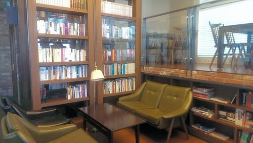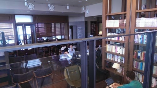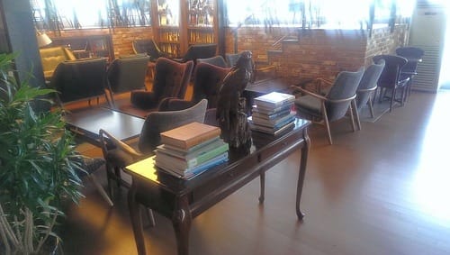 To come back to my start. I want to introduce you my favorite study coffee shop which became like my living and study room during the last semester abroad. The Dokdabang (독수리다방) was opened by a student in 1971 and is one of the most famous study coffee shops in Sinchon. It is located near the Yonsei University not far from the Ewha Womans University. It took me a walk of 8 minutes to get there from my dormitory room. Located in the 7th floor you always have a very wide view above the Sinchon area. Their interior has, as I would describe it, a classic american-library look with book shelves filled with a lot of international must-read literatures and very comfy armchairs. There is also a higher level next to the windows.